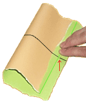 | Als nächstes wird das Blatt wieder halbiert. Beachte dabei, dass sich die (schwarz hervorgehobenen) Faltlinien genau treffen. | ![]() |